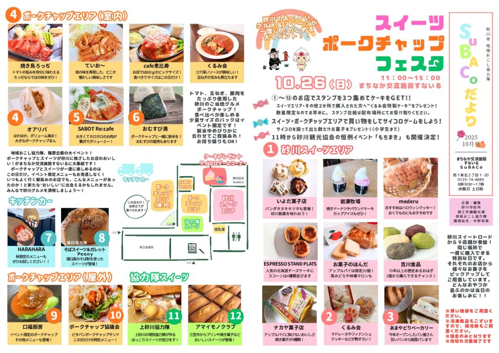 「スイーツ・ポークチャップフェスタ」(主催 砂川市地域おこし協力隊)が開催されます 2025.10.17 ・日時 2025年10月26日(日) 11:00~15:00 ・場所 砂川市まちなか交流施設すないる