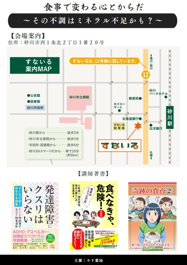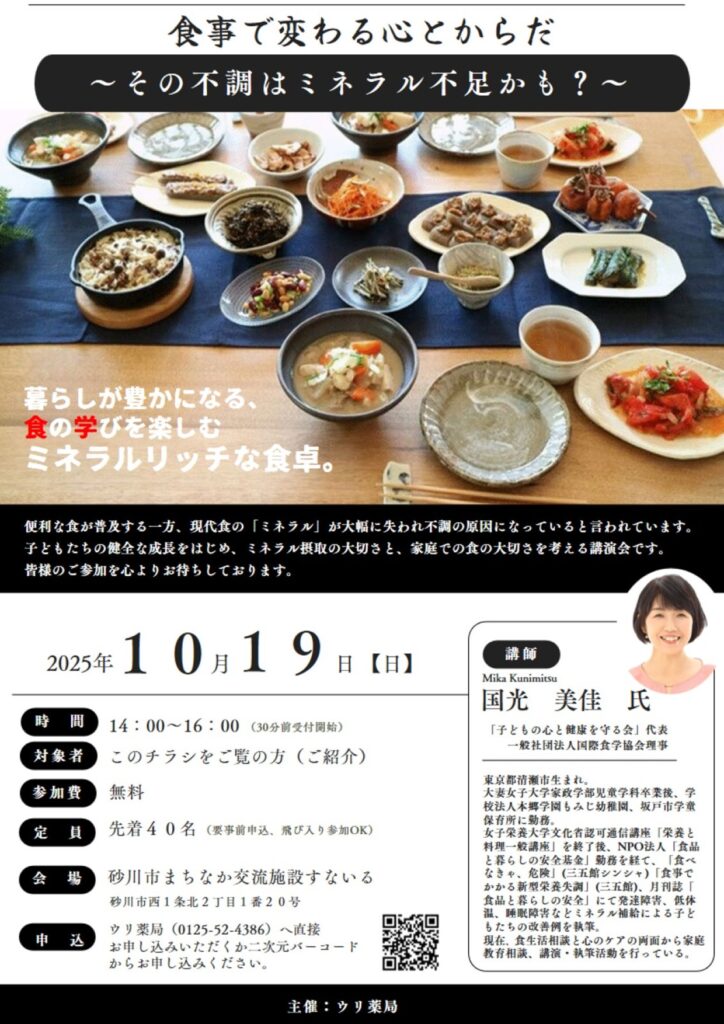 ㈲ウリ薬局主催の講演会「食事で変わる心とからだ~その不調はミネラル不足かも?~」が開催されます 2025.10.14 ・日 時 2025年10月19日(日)14:00~16:00 ・場 所 砂川市まちなか交流施設すないる 多目的室 ・参加費 無料 ・定 員 先着40名(要事前申込、飛び入り参加OK) ・申 込 ㈲ウリ薬局(電話 0125-52-4386)へお申し込み下さい